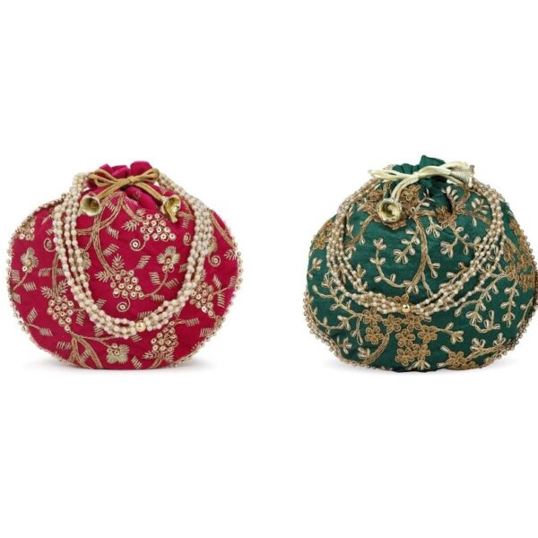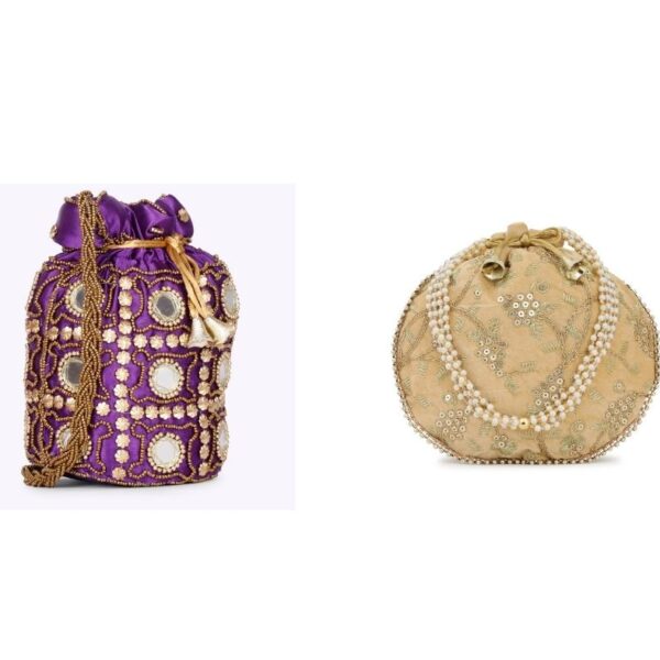 This product is a combo of tow Embellished potli bags having wrist loop 1 main compartment each with drawstring closure. Size & Fit Size of each potli bag : 9 x 9 x 3 Inch (Length x Width x Depth ) Material & Care Fabric Wipe with clean, dry cloth
