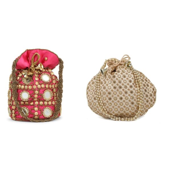 This product is a combo of tow Embellished potli bags having wrist loop 1 main compartment each with drawstring closure. Size & Fit Size of each potli bag : 9 x 9 x 3 Inch (Length x Width x Depth ) Material & Care Fabric Wipe with clean, dry cloth