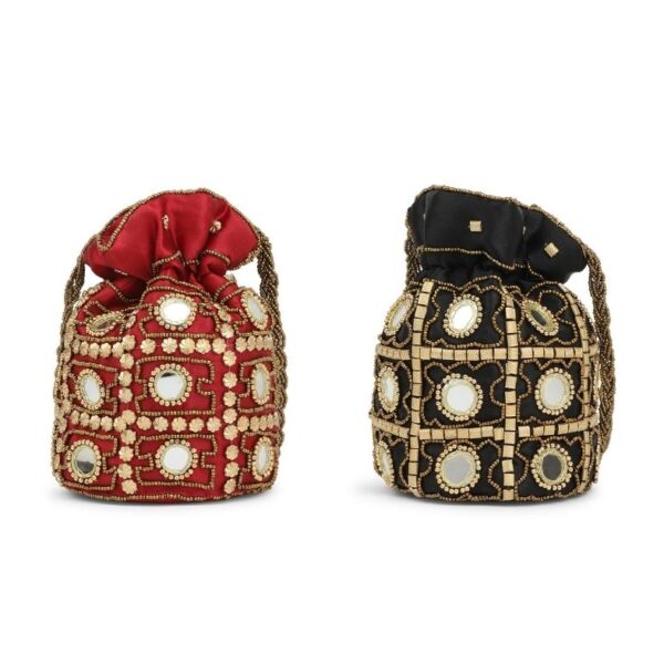 This product is a combo of tow Embellished potli bags having wrist loop 1 main compartment each with drawstring closure. Size & Fit Size of each potli bag : 9 x 9 x 3 Inch (Length x Width x Depth ) Material & Care Fabric Wipe with clean, dry cloth