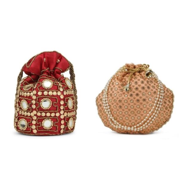 This product is a combo of tow Embellished potli bags having wrist loop 1 main compartment each with drawstring closure. Size & Fit Size of each potli bag : 9 x 9 x 3 Inch (Length x Width x Depth ) Material & Care Fabric Wipe with clean, dry cloth